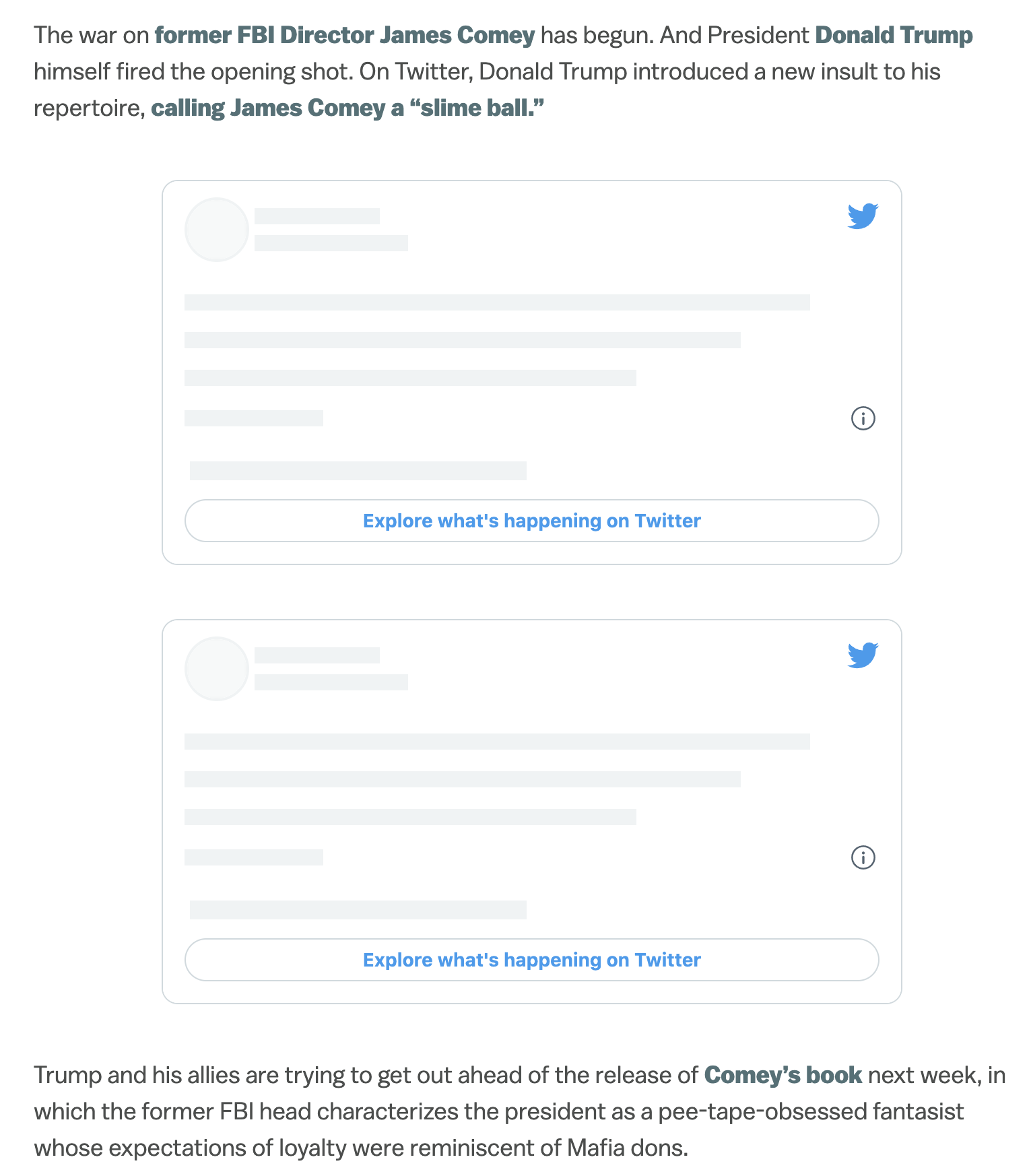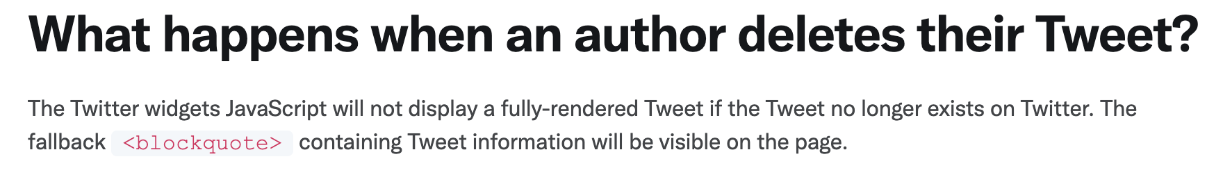 Until recently, if the tweet or account had been deleted, then Twitter would leave the blockquote alone, so the embedded text would still show, but without Twitter’s validation.